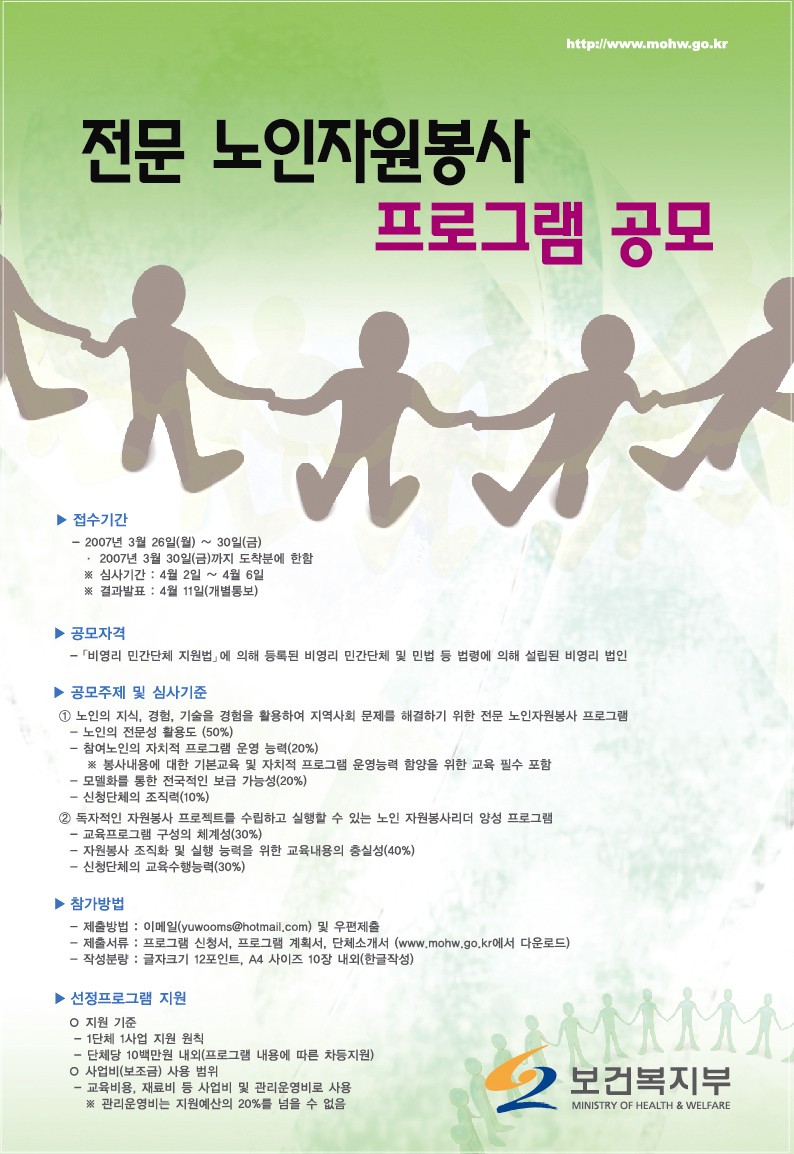 보건복지부의 요청에 따라 아래와 같이 "전문 노인자원봉사 프로그램" 공모내용을 알려드리오니